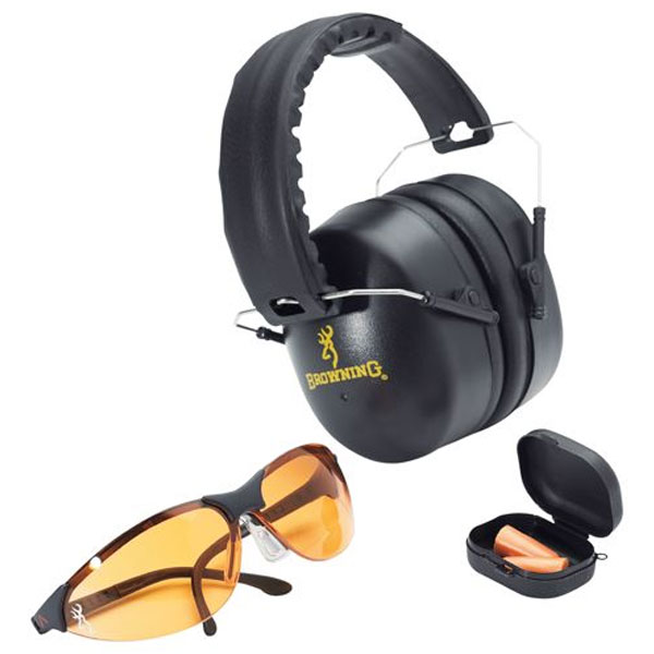 Комплект для стрельбы Browning Shooting Range Kit состоит из: тонированных поликарбонатных очков для стрельбы, берушей из мягкой пены до 31 дБ и наушников до 27 дБ.